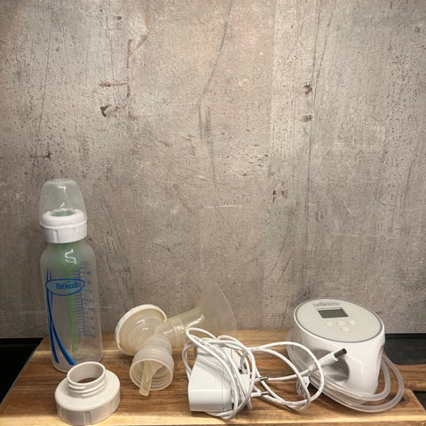 Medela Manuell brystpumpe med tilbehør inkludert flaske, brysttrakt, og lokk. Produktet er designet for manuell pumping av brystmelk.