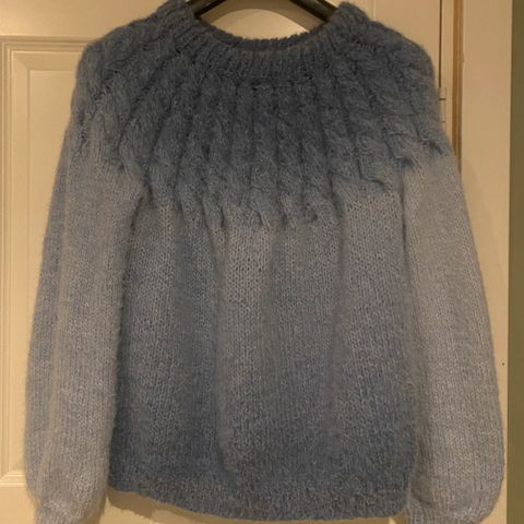 Hjemmestrikket genser med hullmønster i en fin blåfarge.
