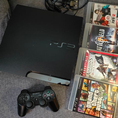PlayStation 3 spillkonsoll med kontroller og spill