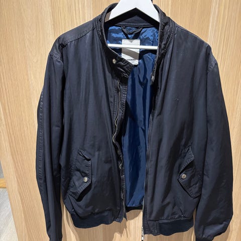 Oliver Brown jakke i størrelse L for herre, farget blå. Jakken har glidelås, brystlomme med glidelås og ribbestrikkede mansjetter og linning.
