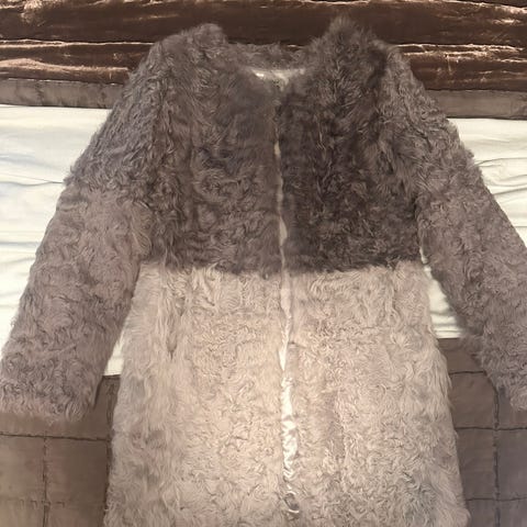 Veldig pent brukt lammeskinnskåpe. Ingen skader eller slitase. Litt lang og lett utsvinget modell. Størrelse 44.