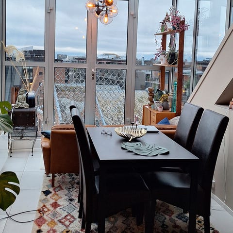 4 spisestuestoler i imitert skinn selges til 600kr. stk. Stolene selges samlet for 2200kr. Stolene gynger/vipper litt og er gode å sitte på.