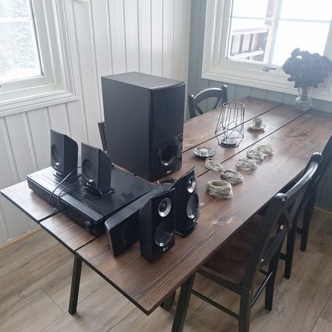LG hjemmekinosystem med flere høyttalere og subwoofer. Systemet inkluderer en DVD-spiller, fjernkontroll og høyttalere. Passer for bruk i hjem for lydavspilling og underholdning.