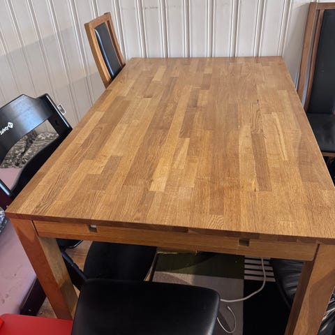 Fint spisebord kun brukt i 1 mnd. Følger 4 spisestoler fra ikea. Trekkene kan vaskes.