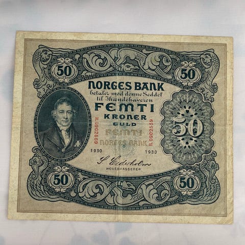 norsk seddel, 50 kr, 1931, uvanlig, norges bank, pengesedler, samlerobjekt