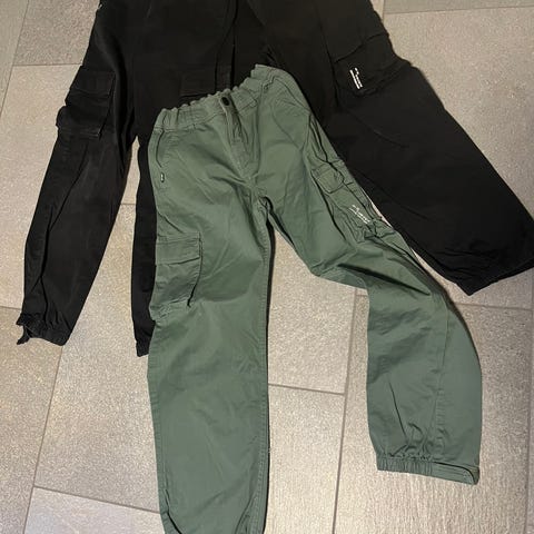 2 stk KappAhl baggy/loose fit bukser (en blå og en svart)i størrelse 158 for gutt. Den svarte buksen har en liten blå malingsflekk foran på høyre lomme, se bilde. Buksene selges samlet for kr. 150,-