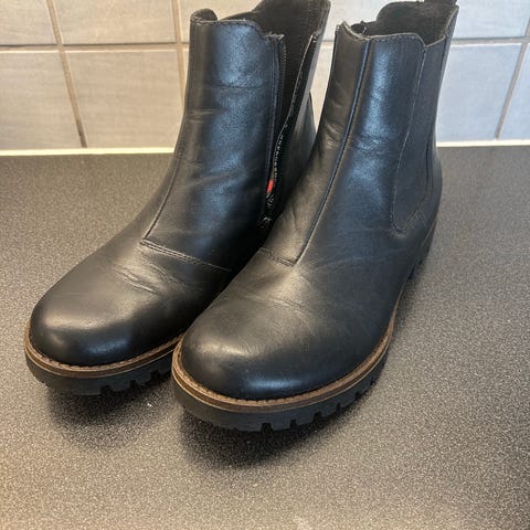 Rieker vinterstøvler i størrelse 39, sort farge. Støvlene har en solid såle med godt grep og er foret med et hvitt, mykt materiale for varme og komfort. Egnet for bruk i kalde værforhold.