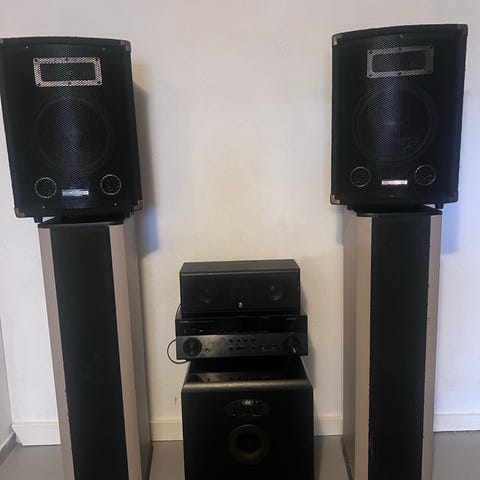 Yamaha YHT-196 hjemmekinosystem med flere høyttalere inkludert subwoofer, senterhøyttaler og satellitthøyttalere. Systemet er designet for å gi surroundlyd i hjemmet og inkluderer en receiver med flere tilkoblingsmuligheter. Farge svart.