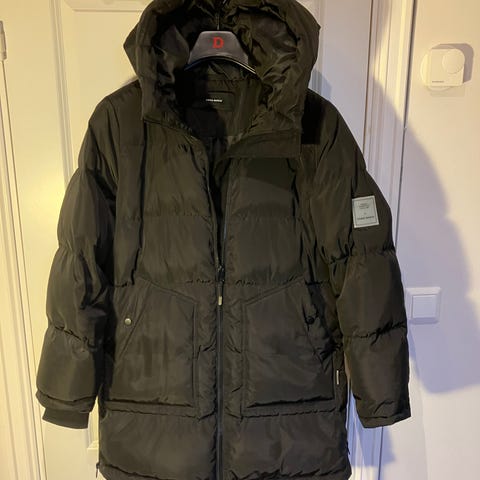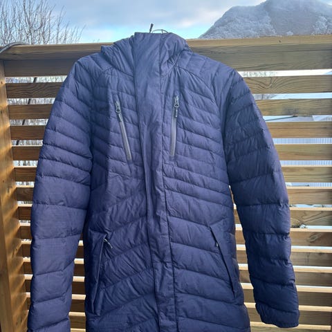 God og varm dunjakke i brun farge, størrelse L for dame. Jakken er laget av dun som isolasjonsmateriale.. Den har hette og glidelås foran, designet for å gi varme i kaldt vær.