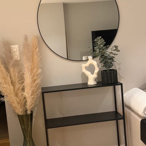 Med 2 romslige skuffer og glass skyveskap under med to hyller i. Svart.