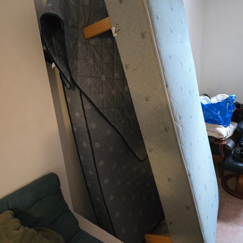 Seng med sengegavl og overmadrass gis bort