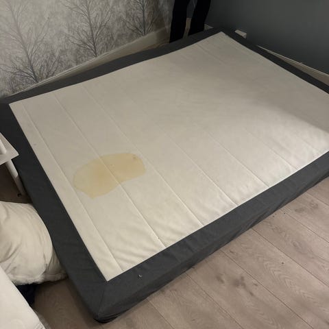 Seng med sengegavl og overmadrass gis bort mot henting. Helt grei stand og fullt brukbar. Noen flekker på overmadrass. Perfekt for student, gjesterom eller midlertidig løsning.