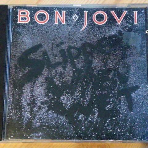 Bon Jovi Slippery When Wet CD. Musikkalbum med cover som viser bandmedlemmer. Inneholder flere låter som er listet på baksiden av coveret.
