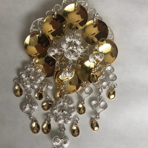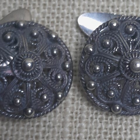 Eldre unik halsknapp I sølv. Forgylt, noe slitasje grunnet alder. Bredde 2cm lengde 10cm