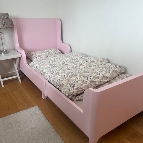 IKEAsengen Busunge i rosa. Sengen er uttrekkbar og kan dermed justeres i lengden. Sengen har bruksmerker, men er ellers i god stand.