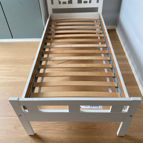 IKEA SLÄKT enkeltseng i hvit farge. Sengen er designet for barn og har en enkel og funksjonell utforming. Den passer til standard enkeltsengmadrass og kan kombineres med tilhørende oppbevaringsløsninger.