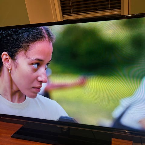 Grundig TV med flere tilkoblingsmuligheter inkludert AV, audio, SCART, HDMI og USB-porter. TV-en har en flat skjerm og en rund fot for støtte. Kontroll følger med.