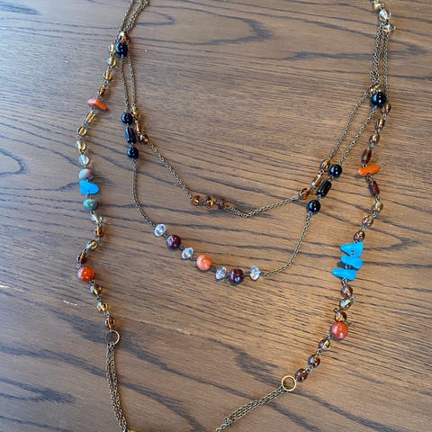Maanesten damekjede laget i sølv med innslag av halvedelstener. Kjeden har en kombinasjon av materialer som gir et unikt og dekorativt uttrykk.