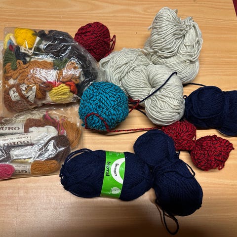 20 nøster som er stort sett hele, noen få nøster/smårester i tillegg. Stort sett ullgarn