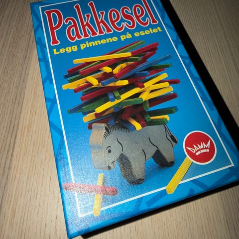 Pakkesel spill for barn fra 5 år. Spillet inkluderer en esel-figur og fargede pinner som skal legges på eselet. Spillmaterialet er laget for å utvikle finmotorikk og konsentrasjon. Fra 5 år