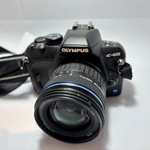 Olympus speilreflekskamera E-450 pent brukt. Inkludert er m.a. anna zoomobjektiv og ekstern blits, batterilader, cd med instruksjonar, minnekort og veske. Originalemballasje følger med.