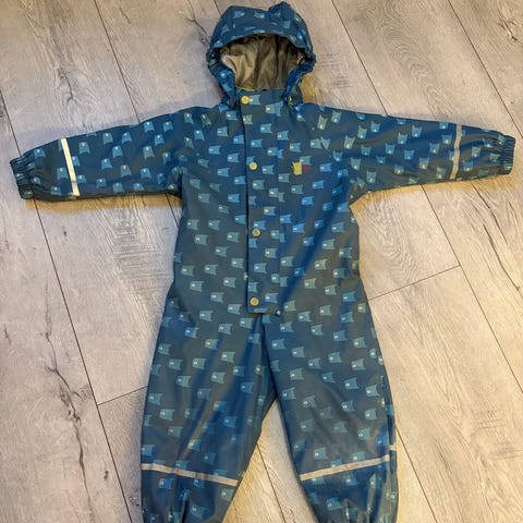 Regndressen er godt brukt og hel strikk til føttene. Med slitasjeskader på normale steder, se bilder, knær, baken og øverst ved glidelåsen. Masse bruk igjen.