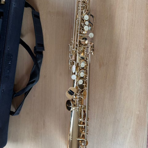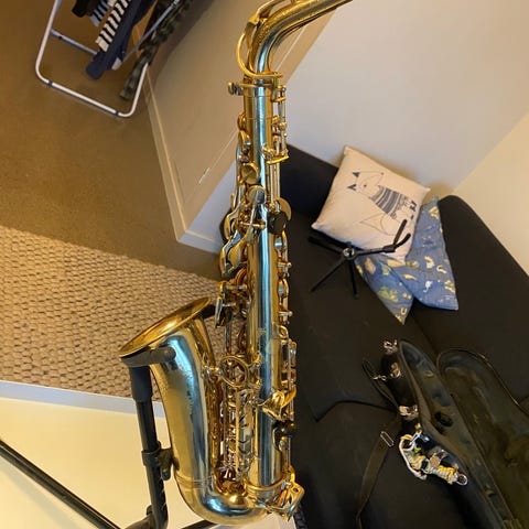 Roy Benson AB-101 altsaksofon med gullfarget finish. Instrumentet har standard design med flere klaffer og perlemorsknapper. Egnet for musikere som spiller altsaksofon.