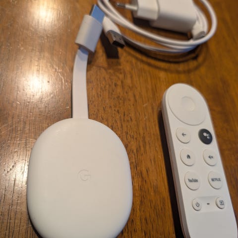 Google Chromecast medfølger HDMI-adapter for streaming av innhold til TV. Enheten kobles til TV via HDMI-port og gir mulighet for trådløs overføring av video og lyd fra kompatible enheter.