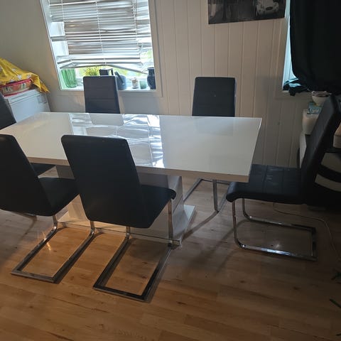 Selger et hvit spisebord med lyse trebein og 7 stk hvite stoler med trebein. To av dem er bøttestoler i fasong. Stolene er like hele og fine, bordet har noen bruksmerker på kanten. Selges samlet for kr. 3000