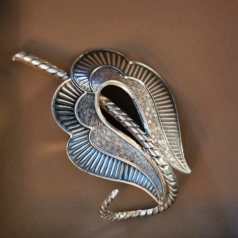 Flott brosje av Bernhard Hertz. Stemplet med "B.H. H6 827". Dansk design. Dansk smykkekunst. Selges for nærmere 4000 fra bruktbutikk i København. Ca. 3,5 cm fra øverst til nederst.