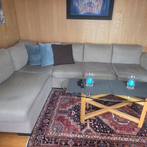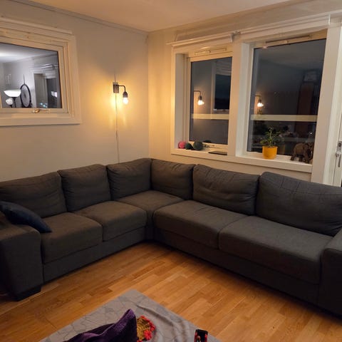 Sofa gis bort mot henting. Husker ikke hvor sofaen er fra, men det er skeidar eller bohus, ikke IKEA. Sofaen er god å sitte i. Har en katt som har kloret litt på sidene, derfor gis den bort. Det er ikke altfor påfallende og jeg tenker det meste kan «pirkes» inn igjen i sofaen.