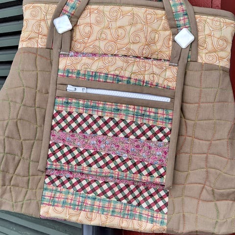 Veske med tilhørende lomme i bruntoner i lappeteknikk