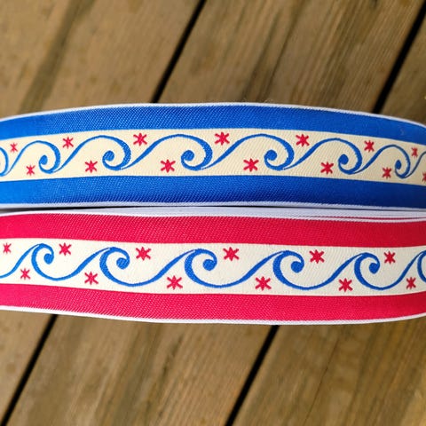 Båndet er 3 cm bredt. 5,10 m langt