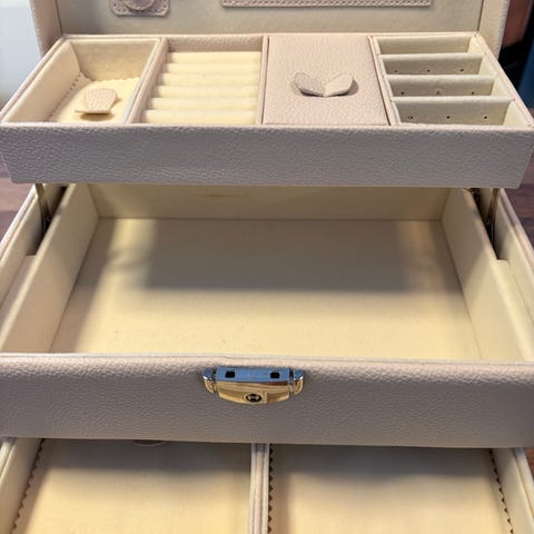 Smykkeskrin i to etasjer. Nøkkel mangler. Pent brukt.