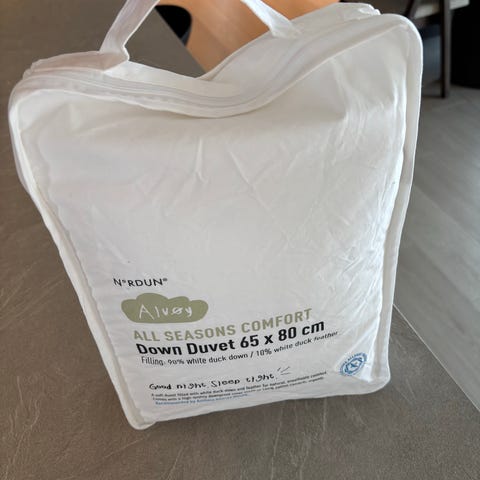 Pent brukt. Barnet har hele tiden sovet i nattpose, og dynen har vært i bruk som tillegg. Ny pris 899,-