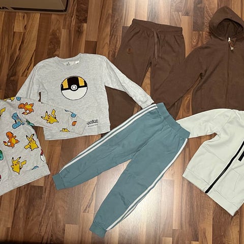 2 skjørter lang ermer, 1 hvitt kort arm. 2 Pokemon shirts, beige polo, fleece med isbjørn, kort jeans.