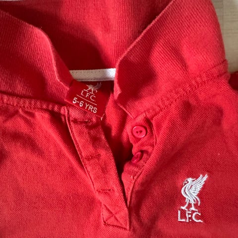 Liverpool T-skjorte selges billig pga noe slitasje foran, se bilde. Ellers hel og fin.