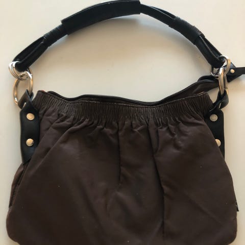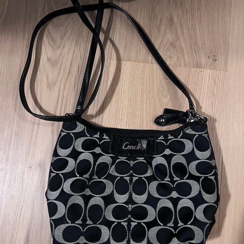 Coach lignende stoff veske for dame. Vesken har et mønster i stoffet og har håndtak i kontrastfarge. Den har glidelås og rom på innsiden for organisering av småting.