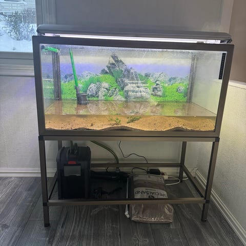 Akvarium med stativ og dekorasjoner