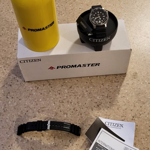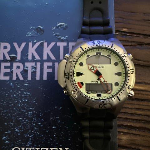 Citizen Promaster 200m Diver med digital og analog visning. Klokka har full Lume og kommer med ny original rem, natostrap samt en tilpasset gummirem.