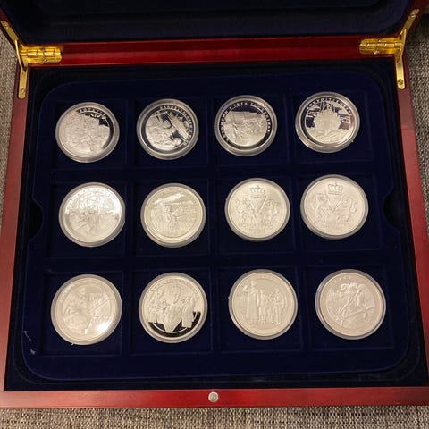 Norge V-krig 1940-1945 sølvmynt. Myntserie med motiv fra Norges krigstid 1940-1945, preget i sølv. Samleobjekt med historisk betydning. Hver mynt veier 20 gram total 25 stk . Netto vekt 500 gram rent 999 sølv . Kan sendes