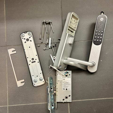 Selges helt ny Tuya elektronisk dørhåndtak med digitalt låsesystem i svart farge. Inkluderer mekaniske deler for montering og tilbehør. Designet for enkel installasjon på dører med standard mål. Passer for boliger eller kontorer som trenger digital adgangskontroll.