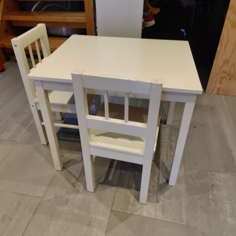 IKEA barnemøbler bestående av et bord og to stoler i hvit farge. Møblene er laget i tre og egnet for barn. Settet kan brukes til lek, tegning og andre aktiviteter for barn.