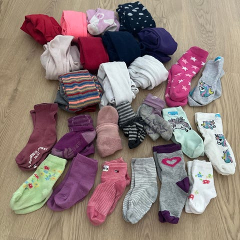 En del sokker er rundt størrelse 28-33 , men det er noen par i både mindre og større str enn det i pakken. En 2pac er ubrukt ellers så er alle sokkene brukt i varierende grad. Følger med noen par som ikke er avbildet.