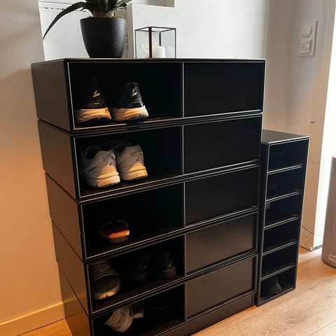 Montana mediabenk, to ytterrom med plass til høytalere, alle frontene er perforerte i stål. Er i en dus pistasjgrønn farge.