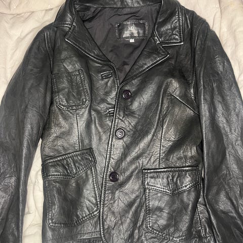 Selger en sort skinnjakke i ekte skinn (Vera Pelle), produsert i Italia. Jakken har en feminin, innsvinget passform og høy krage med trykknapper. Klassisk og tidløs modell som passer til både hverdags og kveld.