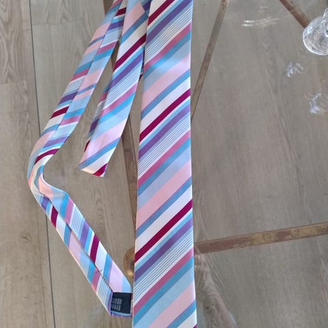 Italiensk slips i 100% silke fra Santi. Sølvgrå farge med mønster i ulike teksturer. 8 cm på det bredeste. Pent brukt. Kan hentes i Oslo eller sendes. Kjøper betaler porto.