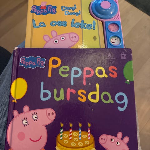 Den største Peppa gris figuren lager lyder og hører egentlig til et spill der man gjemmer Peppa og skal lete etter henne ut fra lyder som høres.