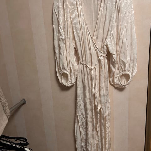 H&M festkjole i størrelse XS, farge beige, laget av polyester. Kjolen har en enkel og elegant design med utskjæringer på sidene og en kort lengde. Egnet for formelle anledninger eller festbruk.