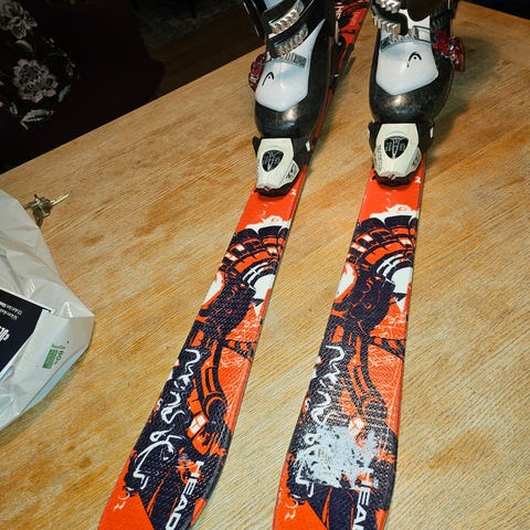 Head alpinski til barn, twintip , med lengde 106 cm. Bindingene kan lett stilles inn til å passe støvler i str 223 helt opp til 322. Pent brukt, noen små bruksmerker.